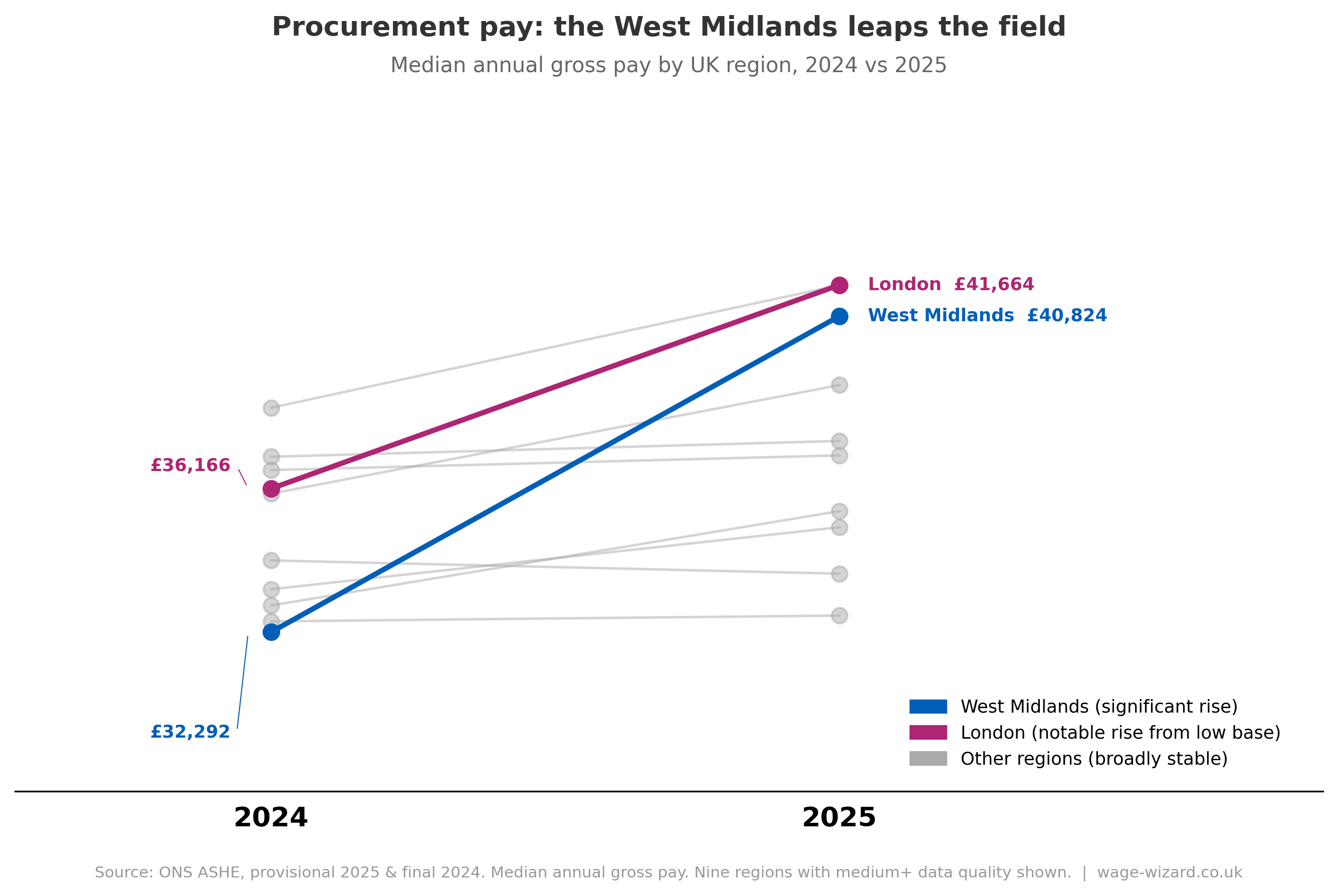 Median annual pay for procurement professionals in the West Midlands rose from £32,292 to £40,824 between 2024 and 2025, an increase of 26%. Most other regions saw increases of 1-9% or stayed flat. Scotland and the North West barely moved.